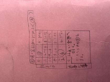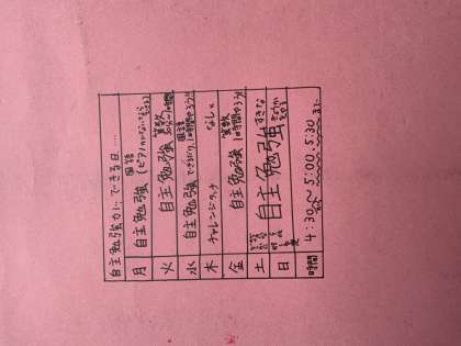 「自分の生活サイクルを考えて,家庭学習を(自主勉強)を取り入れていこう」という話をクラスでしました。その話をした後の予定表の裏表紙にこんな表が書かれていました。自分なりに,何か取り組もうとする意識がうかがえて,うれしく思いました。