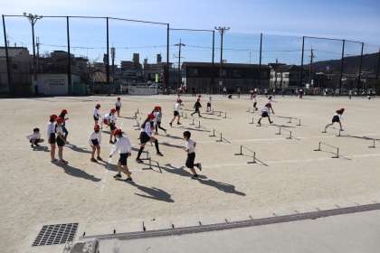 初めてハードル走の学習をしました。まずはじめに,インターバル内の足の運び方「トン・1・2・3」のリズムを定着させるためにミニハードルで練習しています。リズムよく走り抜けられるように練習していきたいと思います。