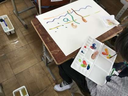 絵の具を使って混色したり水の量を調節したりして模様を描きました。どの子も進んで楽しんで学習をしました。