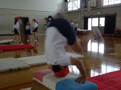 とび箱で少し段差をつけた場やウレタンマットの場で,コツをつかめるように練習しています。
