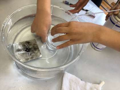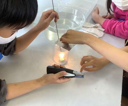 理科の学習でものの燃え方の学習をしました。空気中のどの気体によってものが燃えるのかを実験を通して学びました。水上置換法を活用して気体を集め,ろうそくを入れました。ろうそくの色が明るく変化したり,すぐに消えたりと結果が表れるたびに驚きの声が聞こえました。