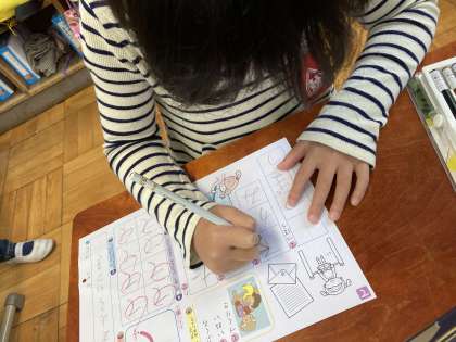 「て」のつくことばでは「てんぷら」「てんぐ」「てるてるぼうず」などをかんがえ はっぴょうしていました。