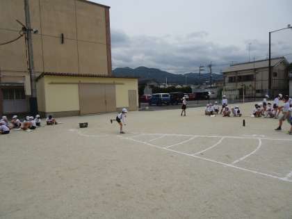 新体力テストでソフトボール投げをしました。物を遠くへ投げる力をはかりました。力いっぱいボールを遠くへ投げていました。