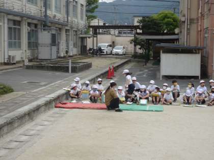 新体力テストで幅跳びをしました。跳躍力をはかりました。後ろに倒れこんでお尻や手をついてしまうと,記録が低くなってしまうので,できる限り前へ倒れこもうと意識しながら跳んでいました。