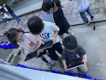 あさがおのめが でてきたので たぶれっとをつかって あさがおのめのしゃしんをとりました。