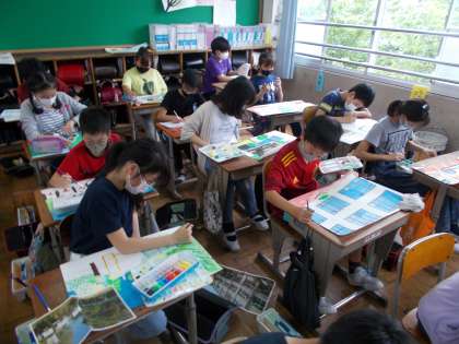 図画工作で風景画を描く学習をしています。色遣いを意識して丁寧に描きました。