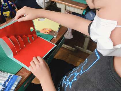 図工の学習で仕掛けカードを作りました。「誰に感謝の思いを伝えたいですか?」と聞いて思い浮かんだ相手のことを考えながら作りました。