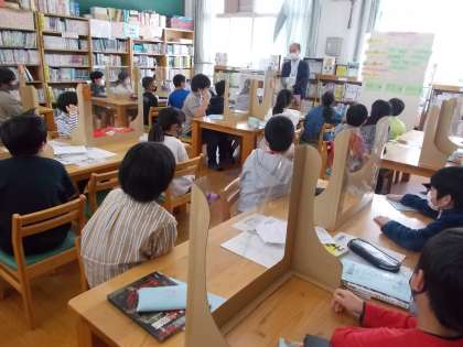図書館司書の先生に図書館利用のお話をしていただきました。図書館には,物語だけでなく調べる時にとっても役立つ資料がたくさんあることを教えてもらいました。