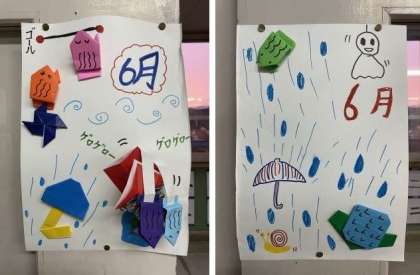 飾り係が6月の飾りを作ってくれました。梅雨の季節に合わせた飾りです。とっても上手な作品でした。