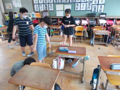 教室掃除をしていて,机を置く印が薄くなっているのに気が付いた子どもたち。マジックを渡すとみんなで印を書いていました。今日の掃除終わりは,とっても机が綺麗でした。