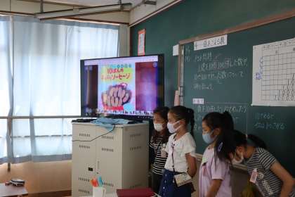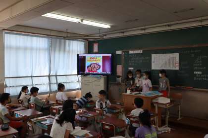 普段だったら絵本の絵を見るために教室の前のほうに集まり読み聞かせを聞きます。しかし,コロナの影響でそれはできないので絵本をタブレットで撮り,テレビに映していました。