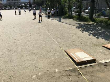 はばとびの学習も折り返し地点に入りました。これまでの3mの助走から10mに変わりました。10mの助走に慣れない子もいましたが,練習していくうちにスムーズにとべるようになった子もでてきました。これからが楽しみです。
