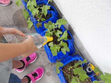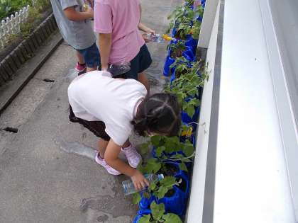 こどもたちは あさがおの せいちょうに きづき よろこんでいます。