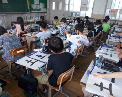書写学習で「土」を書きました。前回は,「二」で横画だけでしたが,今回はたて画もふえ,みんなたくさん練習して清書に挑んでいました。