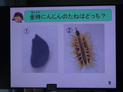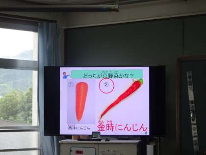 金時人参について学習しました。普通の人参よりも細長いことや,種がトゲトゲしていることなども学習しました。