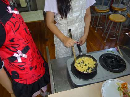 熱の入り具合を確かめて,手早くかき混ぜました。