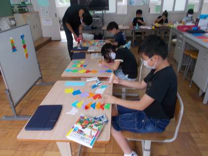 短冊に願い事を書いた後,提灯や五色の飾りを作りました。
