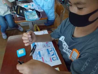 練習用の布を使って本返し縫いやかがり縫い,ボタン付けなど本格的にさいほうの練習を始めています。なかなか難しいですが,子どもたち同士,互いに教え合いながら学び合っています。
