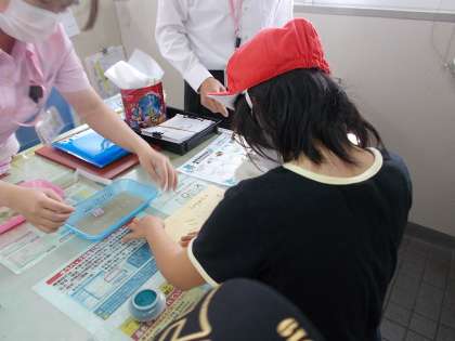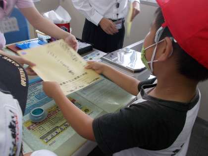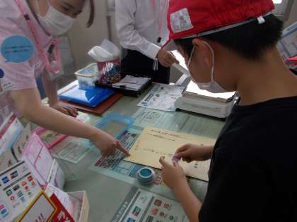 郵便局の窓口で,手紙の重さを計ってもらった後,切手の貼り方を教えてもらいました。