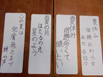 春から子どもたちは季語を使って俳句を書いてきました。今回は夏の季語を使って俳句を書きました。その後,初めてみんなの中で一番の俳句を選びました。写真にあるのはベスト4の子どもたちの俳句です。