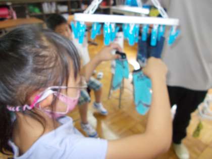 もみ洗い,つまみ洗い,ねじりしぼり,すすぎをした後,干しました。