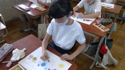 お話に出てくる登場人物やもののイメージをふくらませて,色に表す活動をしました。クレパスを使って,重ねぬりやぐるぐるぬり,ぼかしぬりなど,自分のイメージがどうすれば表現できるか,真剣に試行錯誤する子どもたちでした。