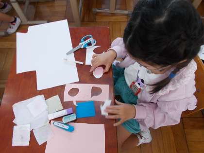 まえのじかんにつくったものを がようしにはったり そこにがようしをはったりして さくひんをつくりました。