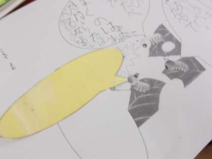 マイふきだしをつかって あおむしのこえを きいています。
