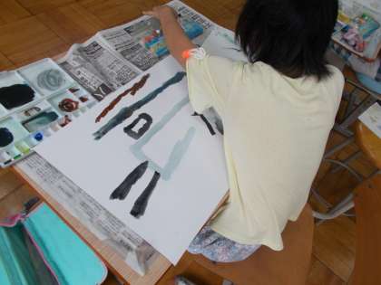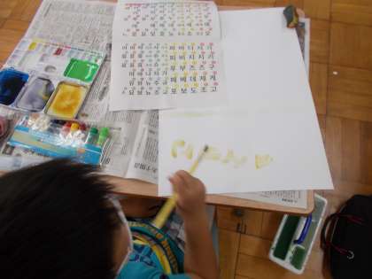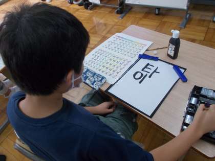 ハングルを見てイメージをふくらませ,デザインを描く児童もいました。