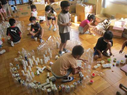 いろいろな材料を使って,遊びを考えました。並べてたり,投げてみたり…それぞれに工夫して,楽しそうに遊んでいました。