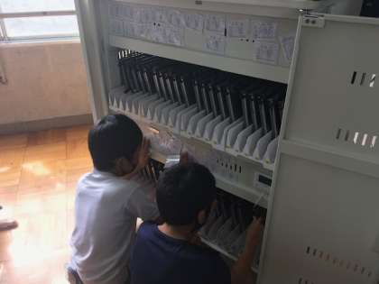 教室で使っているタブレットはテレビ下の倉庫に保管しています。普段は扉に隠れて見えないところですが,きれいにそろえられているとやはり気持ちがいいです!常に大切に使いましょう!
