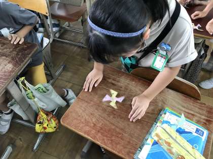 算数科の学習でこまを回し,回っているこまの模様がどのような形に見えるのかを調べました。回っている模様は円い形に見えました。これから,円い形について学習を進めていきます。