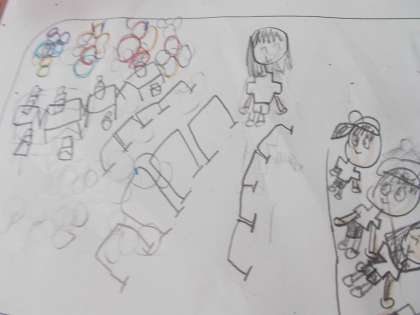 子どもたちは うんどうじょうに むかうとちゅう 「きんちょうしてきた!」と いって ドキドキしながら スポーツフェスティバルに いきました。