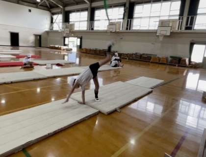 子どもたちは,自分ができる技をマットの端まで連続して回ることに挑戦しています。