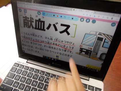 子どもたちは タブレットをつかいながら せんをひいて しらべています。