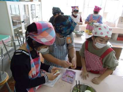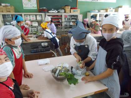 粉ふきいもで,じゃがいもの皮むきにピーラーを扱いました。じゃがいもの芽を取るにも一苦労してましたが,しっかりと取ることができてました。