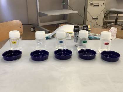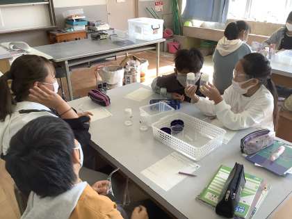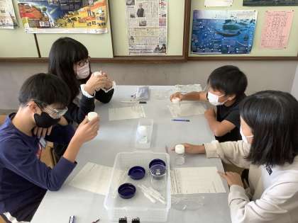 理科の学習で水溶液の性質についての学習をしています。水溶液の色,におい,燃えた後について調べ,まとめていきました。においのかぎかたなども教えてもらい,めがねもかけて安全に実験しました。