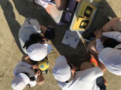 体育科の「ポートボール」で試合の合間の時間で,ホワイトボードを使い,作戦を考えました。ホワイトボード上のマグネットを動かしながら,攻め方や守り方の確認しました。みんな積極的に取り組んでいました。