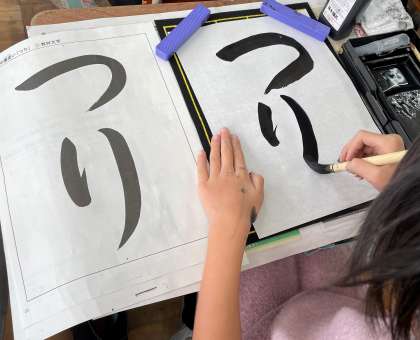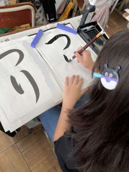 書写の学習で ひらがなの「つり」を書きました。「つ」では,筆の軸を回さないで,丸みをもたせながらゆっくり筆を運んだり,「り」では,1画目から2画目に向けて次につなげるように書いたり,2画目をだんだん力を抜きながらはらったりと,さまざまなポイントに注意しながら集中して取り組んでいました。