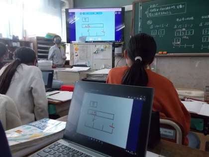 考えの共有をするときに,タブレットの共有機能を使っています。共有機能を使うと,個人のタブレット画面に同じ映像がうつります。そして,そこに発表者が書き込むとリアルタイムで書き込んでいる映像が流れます。この機能を使ってリアルタイムに思考の流れを見られるのはとても良いことです。