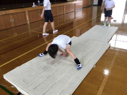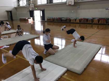 体育の学習で,マット運動をしています。5年生の学習では,4年生の時よりも挑戦する技の数が多くなります。安全に十分気をつけ,今までよりもさらにきれいにできるように,そして,新たな技ができるようにがんばってほしいです!