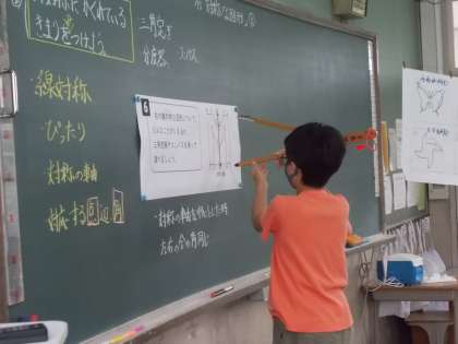 今日は,線対称の詳しいきまりについて調べてみました。コンパス,分度器,三角定規を使って調べた結果,対称の軸を中心に長さや角が同じであることを見つけることができました。