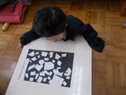 はさみをつかって,おもいおもいに白い画用紙を切りました。
