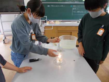 瓶の中が酸素でいっぱいなったところにろうそくを入れます。窒素・二酸化炭素はろうそくの火を入れるとすぐに消えました。酸素は火が消えることがなく燃え続けていました。子どもたちはしっかりと観察していました。