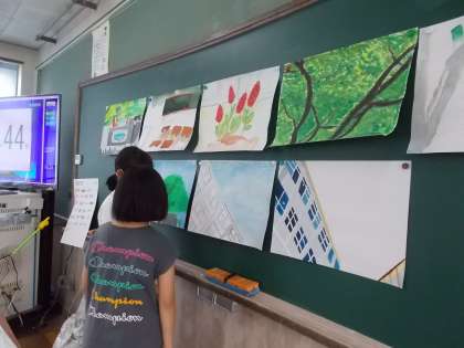現在,自分の好きな場所を描いています。隣のクラスの作品を参考にしながら,制作しています。どのような作品ができるのか楽しみです。