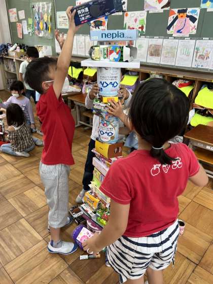 また,つみかさねながら じぶんたちのしんちょうより たかくつめるように おおきさや かたちをみながら くふうしているすがたもみられました。