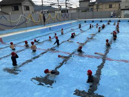 一度雨で水泳学習が中止になりましたが、最後の週には天気に恵まれ、何とか水泳をすることができました。ずいぶんシャワーや水に馴れてきて、楽しみながら泳いでいました。素早く綺麗に並ぶことができるようにもなりました。