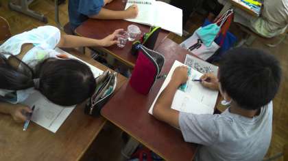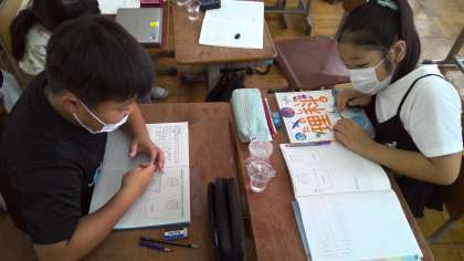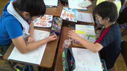 ラップをしなかったコップは水が減り、ラップをしたコップはラップに水がついていることが分かりました。子どもたちは「水蒸気」「蒸発」という言葉を覚え次回は「空気中は水蒸気が漂っているのか」について実験していきます。