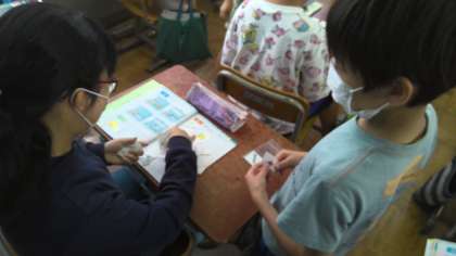 外国語活動の「DO you have a pen ?」で友達のために英語でやり取りして文房具セットを集めて紹介しました。