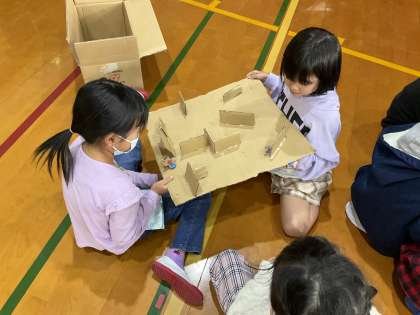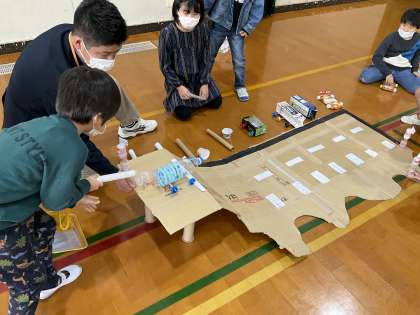 1ねんせいは 2ねんせいが つくったおもちゃを見て「すごい!」「おもしろい!」といって たくさん あそんでいました。